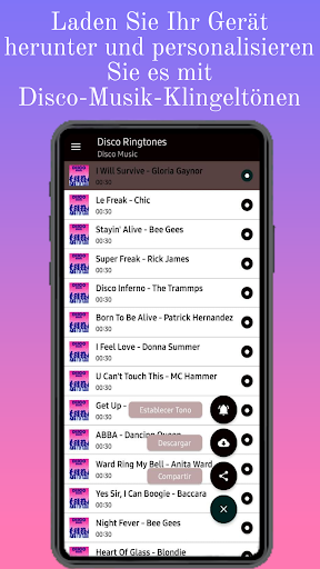 Genießen und teilen Sie die besten Disco-Musiktöne der 70er und 80er Jahre in 90er-Englisch mit den Klängen und Instrumenten der meistgehörten und am meisten kommentierten Band der Welt für mobile Geräte, die diese Anwendung hat, damit Sie sie als kostenlose Disco-Tanzmusiktöne platzieren können .