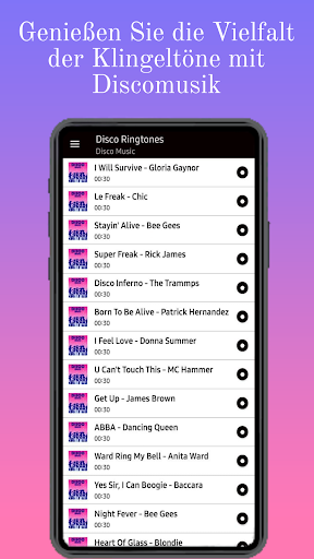 Für diejenigen, die ein personalisiertes Android-Handy haben möchten, haben wir für Sie einzigartige Songs aus dem Besten von Disco Dance 70 80 90, die Sie als Klingeltöne, Wecker und Benachrichtigungen völlig kostenlos verwenden können.