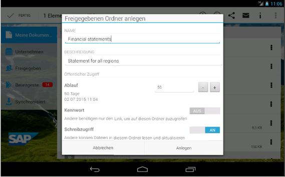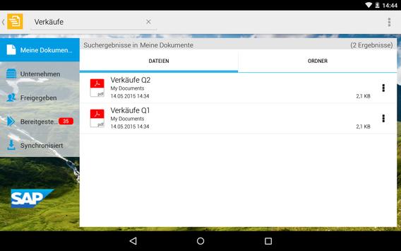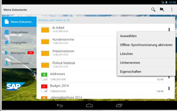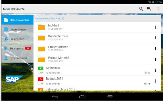 Mit der Mobile-App SAP Mobile Documents für Android haben Sie immer Ihre gesamten persu00F6nlichen und geschäftlichen Dokumente und Inhalte sicher dabei, ganz gleich wohin Sie gehen. Im Unterschied zur manuellen Dateiübertragung über freigegebene Ordner oder E-Mails, ku00F6nnen Sie mit dieser App überall und zu jeder Zeit schnell und einfach Dateien von Ihrem Rechner und von Dokumentenmanagementsystemen Ihres Unternehmens aufrufen und gemeinsam mit anderen verwenden.