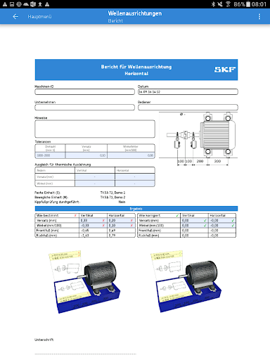 • Automatische Berichte für die Dokumentation der Wellenausrichtung: Sie vermitteln einen vollständigen Überblick über die Prozesse der Wellenausrichtung und deren Ergebnisse. Die Berichte können mit Anmerkungen, Maschinenbildern, Unterschriften usw. kundenspezifisch ausgeführt und einfach per E-Mail oder Cloudservice geteilt werden.
