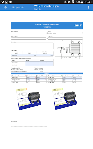 • Demo-Modus: Die Ausrichtungs-App für Horizontalwellen präsentiert eine vollständige Testausrichtung. Der Anwender hat so die Möglichkeit, sich vor dem Kauf eines unterstützten SKF Wellenausrichtsystems vom Nutzen des Geräts zu überzeugen.