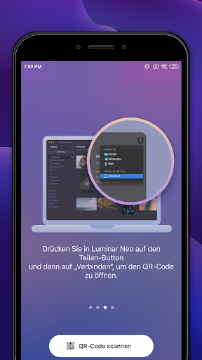 Luminar Share ist eine App, die es Nutzern von Luminar Neo ermöglicht, Fotos ohne Kabel vom Desktop auf das Handy (und umgekehrt) zu übertragen. Außerdem können Nutzer damit bearbeitete Fotos ganz einfach auf ihren sozialen Medien veröffentlichen.