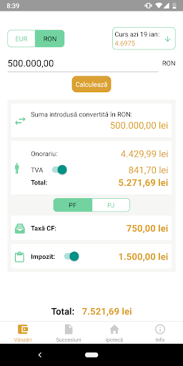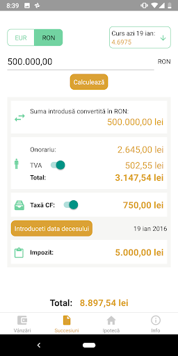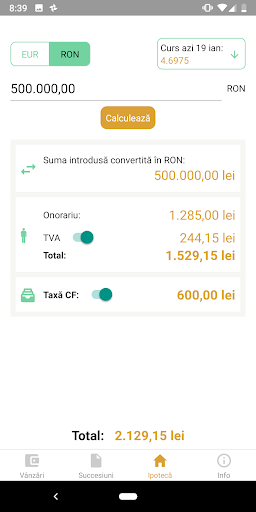 Die Anwendung ermöglicht die Einführung des Werts in EUR und RON.Für EUR erfolgen die Berechnungen an der NBR-Wechselkurs des Tages und haben die Möglichkeit, den NBR-Kurs für den nächsten Tag auszuwählen.