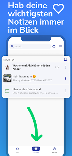 Eine separate Favoritenliste für Notizen und Ordner ermöglicht den schnellen Zugriff auf markierte Notizen und Ordner.