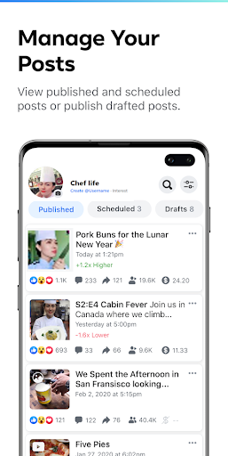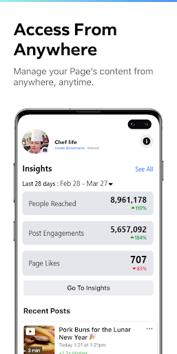 • Zeigen Sie Ihre neuesten Seiten Erkenntnisse anManager und melden Sie sich anschließend mit Facebook an, um alle Ihre Seiten schnell zugreifen und verwalten, wann immer Sie sich befinden.