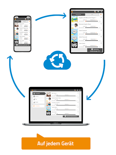 ✓ online und offline, auf Smartphone, Tablet oder PC – Deine Fortschritte synchronisieren sich automatisch zwischen den Plattformen, soweit du online bist