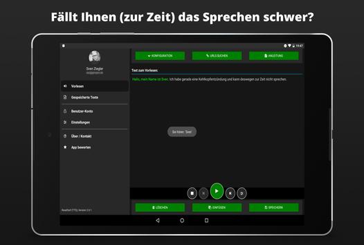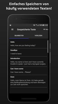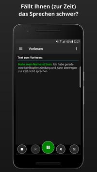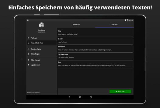 Gerade oder dauerhaft nicht in der Lage selbst zu Sprechen? Wenn Sie gerade eine Kehlkopfoperation hatten oder an einer Kehlkopfentzündung leiden, ist Sprechen nicht möglich. "ReadOut!" hilft Ihnen zuverlässig bei der Kommunikation mit Ihren Mitmenschen. Speichern Sie häufig genutzte Texte einfach ab und synchronisieren sie diese auf alle Ihre Android-Geräte (Premium Funktion).