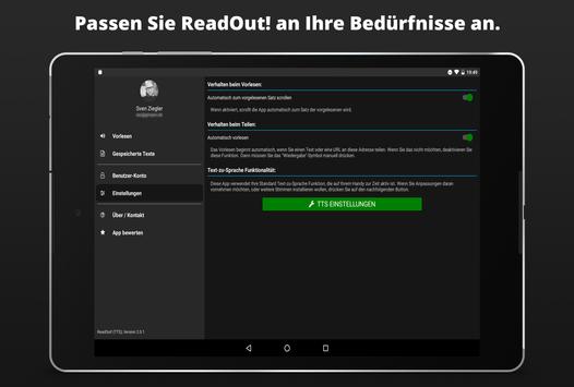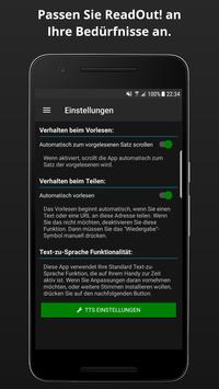 Die App verwendet die TTS-Funktion (Text-to-Speech) Ihres Handys. Abhängig von der Art der Funktion und des Herstellers, können Sie verschiedene Einstellungen vornehmen (z.B. Auswahl einer Stimme). Sie brauchen diese Einstellung in Ihrem Handy nicht mühevoll suchen, denn "ReadOut!" bietet Ihnen dazu eine Verknüpfung in den Einstellung der App an.
