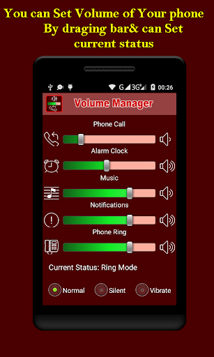 You can set volume of your phone By Draging Bar and can set current status (Normal,Silent,Vibrate)