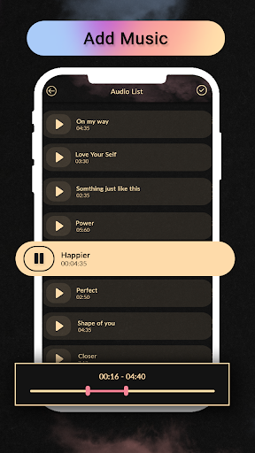 - Klicken Sie anschließend auf Musik hinzufügen und wählen Sie Musik von Ihrem Gerät aus und wenden Sie sich an, wenden Sie sich an, um auf "Text hinzufügen" und geben Sie Text ein, den Sie sehen möchten, was Sie sehen möchten Klicken Sie auf "Speichern" und Sie erhalten ein neues erstelltes Video