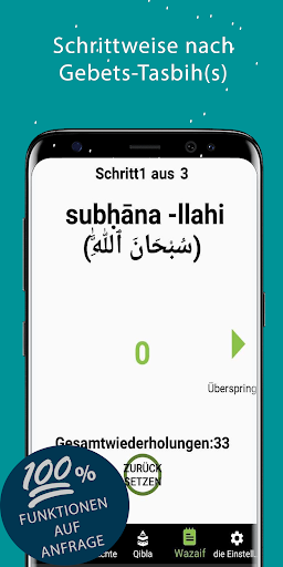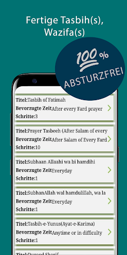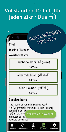 (تسبیحةالزھراء / تسبیح فاطمہ الزھرا). Für jeden Schritt (tesbih) in einem Wazifa (tesbih-Sequenz) zeigt es Text zum Rezitieren und Wiederholungen, um komplexe tesbih-Sequenzen einfach zu machen.