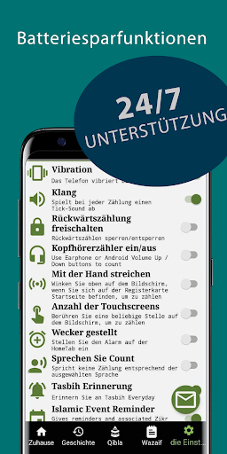 • Sie können wählen, ob Sie die Tasbeeh-Zählung mit den Kopfhörer- oder Lautstärketasten oder dem Näherungssensor erhöhen/verringern möchten, um den Bildschirm auszuschalten und den Akku zu schonen.