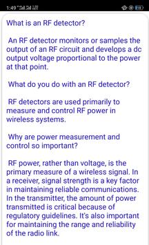 An RF detector, monitors or samples the output of an RF circuit and develops a dc output voltage proportional to the power at that point. RF detectors are used primarily to measure and control RF power in wireless systems. The RF Signal Detector is an application for doing important stuff or to perform some tests with your Android phone. You can monitor the RF and WiFi signal strength as seen by the device as well as WiFi hotspots, describe a cell site's zone of coverage and check signals for currently connected cell state "RF Signal Detector" provides detailed information over the currently used network with accurate signal strength output, whether WiFi (WLAN) or cellular (mobile) connection and is easy to use. RF and WiFi signal strength you will see some more interesting information inside RF Signal Detector,