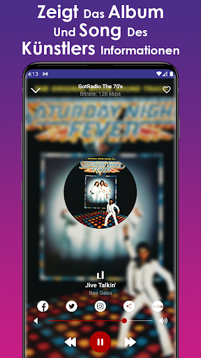 In den unten aufgeführten Radiosendern finden Sie das Beste der 70er Jahre und aller Disco-Musik: 70er Classics, Classic Hits 109 - Die 70er Jahre, Magic 70er Florida, 181.FM Super, 70er Disco Nights, 011.FM - Retro 70er, unter vielen mehr. Diese App funktioniert nicht offline oder ohne Internet, da alle Radiosender korrekt abgespielt werden müssen.
