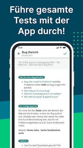 - Volle Testintegration - Reiche Vorabfragen, Berichtseiten und Bugs über die App ein