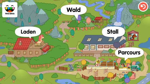 - Erkunde vier Orte: Stall, Parcours, Wald und Laden.