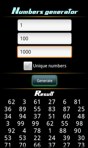 Generate random numbers within the desired interval with this little app. You can generate up to 10000 numbers and you have the option to display unique numbers only. For more features or sugestions please contact me!