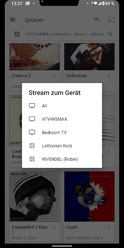 Sie können Medien auf Chromecast™ und Android™ Fernsehgeräte, auf angeschlossene UPnP™ oder DLNA™ Mediaplayer und Smart TVs übertragen oder direkt auf Ihrem Android-Handy abspielen.