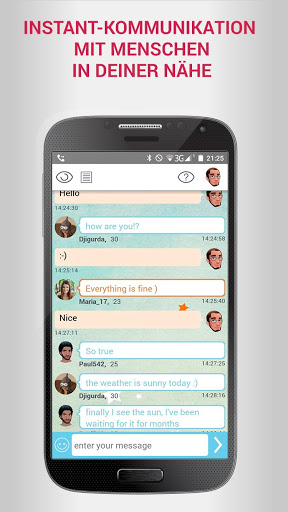 Neue Möglichkeit - der Radius erweitert sich automatisch. Gibt es in deiner Nähe keine aktiven User, so führt die App eine Suche mit erweitertem Radius durch. Ihr Gesprächspartner kann sich überall auf der Welt befinden!