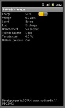 Cette application vous permettra de mieux connaître l'état de la batterie de votre appareil. Sans pub, sans connexion à internet, sans connexion au GPS, cette application fait juste ce qu'on lui demande et n'est pas du tout gourmande en ressource. Si vous avez des suggestions, rendez-vous sur madimediafr@gmail.com