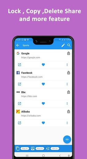 Bookmarks of all web urls lets you store unlimited links of articles, news-posts, websites, or any web-page you found interesting over the internet