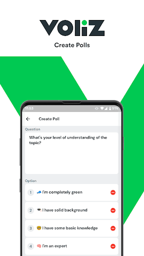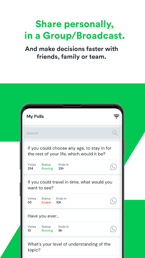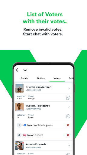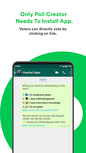 Voliz ist eine Umfrag -App, mit der Sie Umfragen oder Umfragen erstellen können, die einfach auf WhatsApp geteilt werden können.Teilen Sie sie mit Ihren Kontakten, Gruppen, Broadcast -Listen oder Freunden und erhalten Sie ihre Meinungen schnell und einfach mit WhatsApp -Nachrichten.Der Umfrageersteller muss die App herunterladen, aber die Wähler können direkt über ihre WhatsApp abstimmen.Es ist eine einfache, superschnelle und Echtzeit-Polling-App.