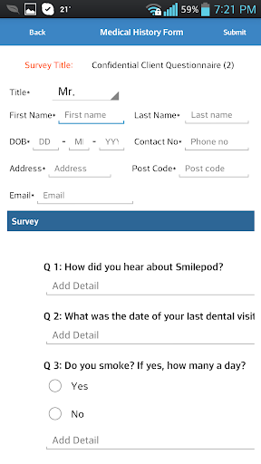 Medical History Forms is primarily created as a flexible way for the UK Hospitals, Medical and Dental practices to get patient medical history using a tablet or phone, easily capture patient answers and get patient signature (requires a stylus based Android Tablet or Phone- Galaxy Note series is recommended).