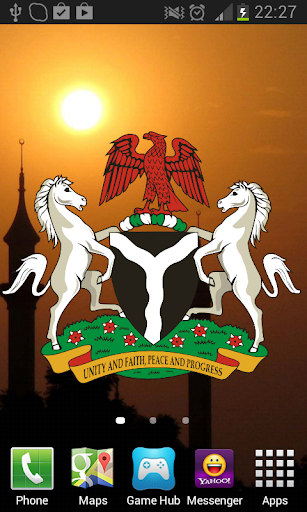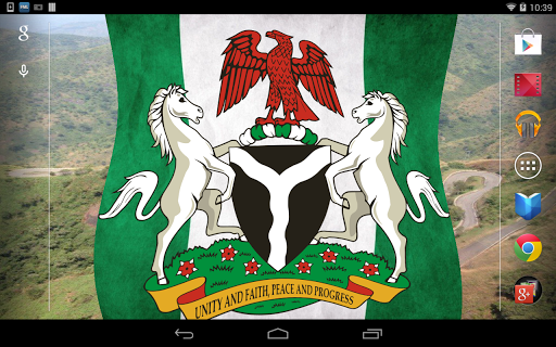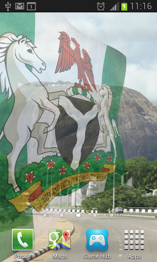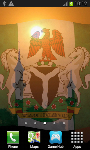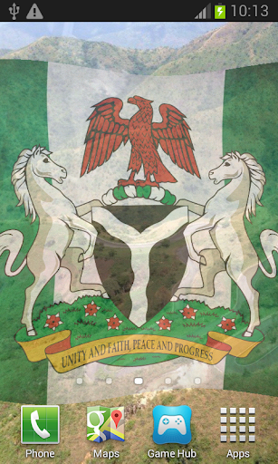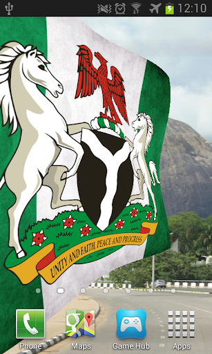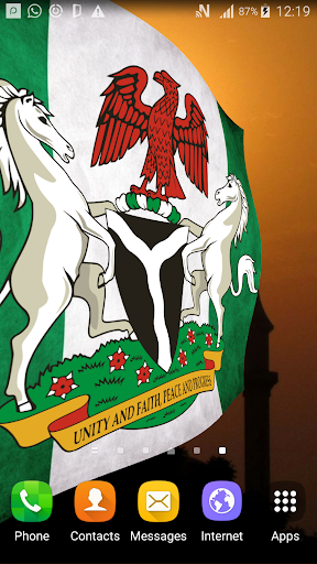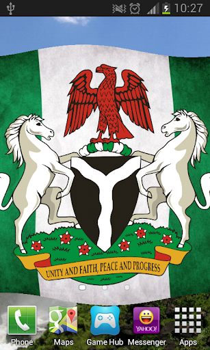Naija-Flagge-Live-Tapete präsentiert schöne touristische Standorte und Sehenswürdigkeiten von Nigeria, überlagert mit dem nigerianischen Wappen oder Flagge, das in einer weichen sanften Brise billig ist.