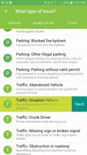 - Users can report quality of life, crime and traffic and parking issues