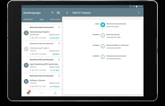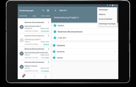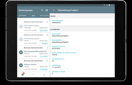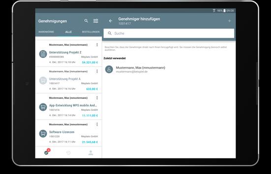 WPS mobile ermöglicht es Ihnen Ihre Warenkörbe und Bestelländerungen überall auf der Welt zu genehmigen. Erhalten Sie Push-Benachrichtigungen für jede neue Genehmigung und sehen Sie sich Details zum Objekt auf Kopf- und Positionsebene an.