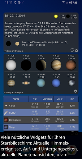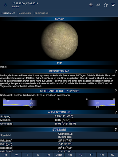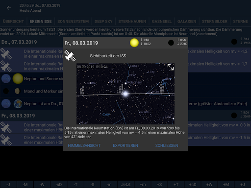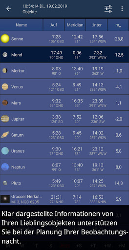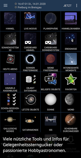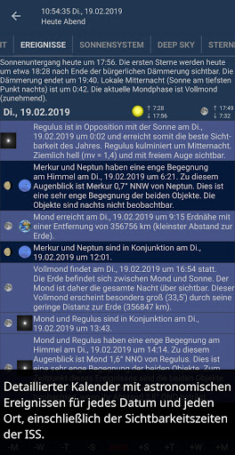 Sie möchten wissen, wann sich das nächste Mal Mond und Jupiter am Himmel begegnen? Ob und wann die nächste Mondfinsternis von Ihrem Ort aus sichtbar ist? Wann der nächste Komet ein helles Abendschauspiel gibt? Sie möchten nie wieder ein spannendes Himmelsereignis versäumen und von Ihrem Smartphone daran erinnert werden? Sie fragen sich, was das extrem helle Himmelsobjekt kurz nach Sonnenuntergang ist? Dann ist diese App genau das, was Sie suchen!