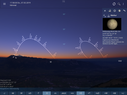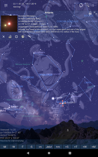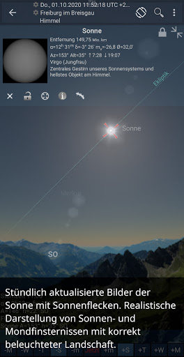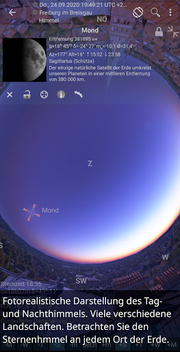 - Fotorealistische Darstellung des Nacht- und Taghimmels bei korrekt beleuchteter Landschaft. Es ist die einzige App für Android, die den Himmel unter Berücksichtigung der atmosphärischen Streuung physikalisch korrekt brerechnet.