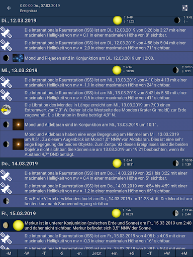 - Kalender mit genauer Beschreibung von astronomischen Ereignissen der nächsten 7 bis 31 Tage