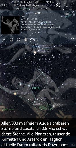 In der App ist eine aktuelle, zoombare Himmelskarte inkludiert, die Ihnen präzise und zuverlässig sagt, welches Himmelsobjekt sie gerade sehen. Damit nicht genug, bietet sie eine Fülle an anschaulich präsentierten Extrainformationen über Sterne, Planeten, Galaxien, Sternhaufen, Nebel, Meteroiten, Kometen, Astroiden, Sonnen- und Mondfinsternisse sowie detaillierte Ephemeriden aller enthaltenen Himmelsobjekte und eine grafische Aufsicht auf das Sonnensystem, die die aktuellen Positionen der Planeten darstellt. All das in nur einer App!