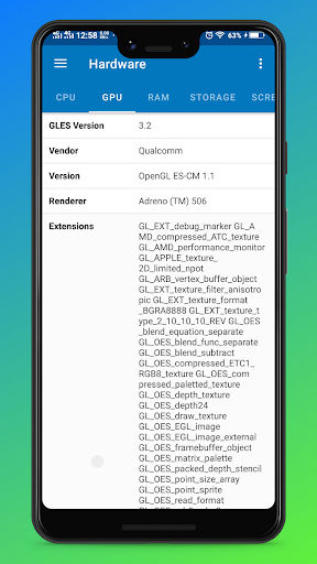 - GPU (Graphics Processing Unit): GLES version, vendor, version, renderer, extensions, etc.