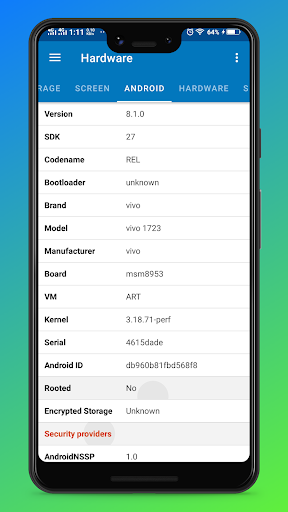 - SYSTEM Information: android version, SDK level, kernel, build ID, root access, etc.