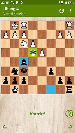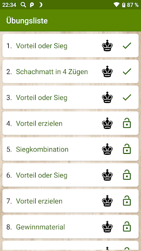 Die kostenlose Version enthält 18 interessante Rätsel mit Siegkombinationen, Erzielen von Vorteilen und Mattsetzen in mehreren Zügen. Nach dem Lösen jeder von ihnen eröffnet sich die Möglichkeit, das gesamte Schachspiel zu sehen, aus dem die Position der Übung gewonnen wurde.