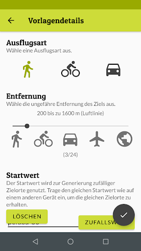 Die ungefähre Entfernung zum generierten Zielort kann vom Benutzer konfiguriert werden, so dass die App für Fitnessaktivitäten wie Radtouren oder Wanderungen in der Umgebung, aber auch zur Ideenfindung für den nächsten Sommerurlaub oder einfach zur Anzeige eines weltweit zufälligen Orts genutzt werden kann.