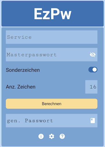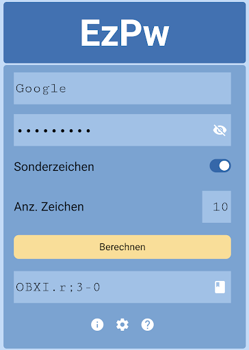 Teste EzPw jetzt kostenlos & unverbindlich und generiere deine Passwörter so, dass du nie wieder die Funktion "Passwort vergessen?" benötigst. Neben unserer Android App gibt es auch eine WebApp, sodass du von einem beliebigen Computer mit Internetverbindung deine Passwörter generieren kannst. EzPw-Web: app.ezpw.de