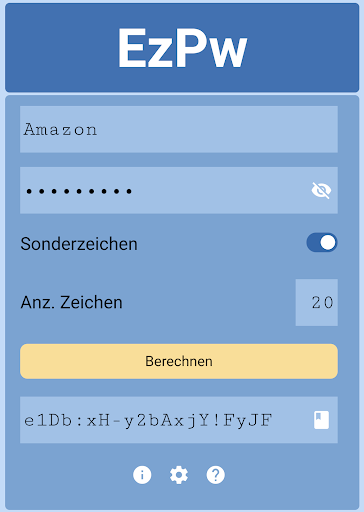 Neue sichere Passwörter zu generieren und jederzeit griffbereit zu haben ohne diese zu speichern, war noch nie so einfach wie mit diesem Passwortgenerator. "EzPw - Easy Password" - Die innovative Mischung aus Passwort Generator und Passwort Manager.