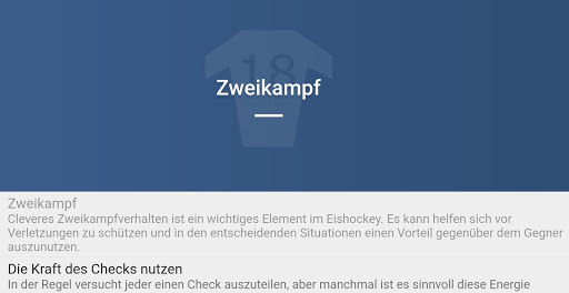 Die App hat eine breite Ansammlung von unterschiedlichen Kategorien aus Tipps, wie Face-off Strategien, Torabschluss oder Puck Behauptung. Alle diese Kategorien beinhalten wertvolle Hinweise, die dein Spiel verbessern. Alle Informationen stammen aus Spielsituationen, die während unserer aktiven Karrieren erlebt wurden.
