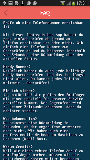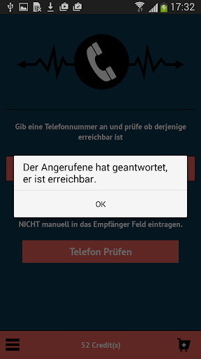 Mit dieser fantastischen App kannst du ganz einfach prüfen ob jemand am Telefon erreichbar ist oder nicht. Gib einfach eine Telefon Nummer zum überprüfen an und du bekommst innerhalb von Sekunden eine Rückmeldung über den aktuellen Status.