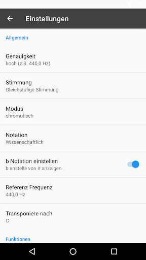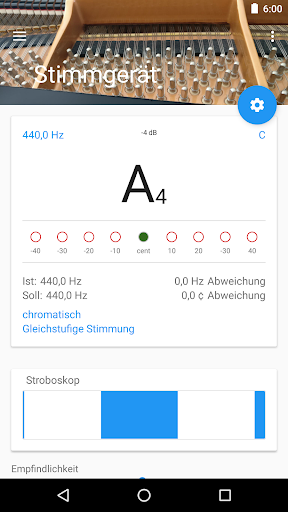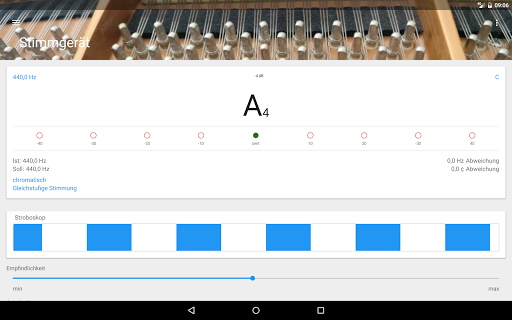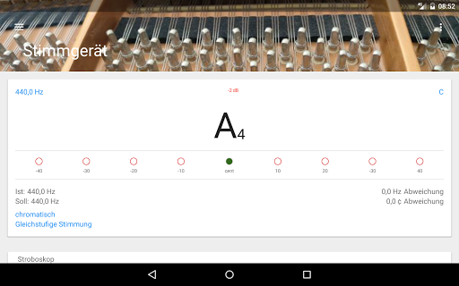 Das Stimmgerät zeigt dir neben dem Namen der Note viele weitere Informationen an. Z.B. die gemessene Frequenz, die Sollfrequenz und Abweichungen hierzu in Hz und Cent. Das Stroboskop gibt dir über die Richtung und Geschwindigkeit der Bewegung die restliche Abweichung an.