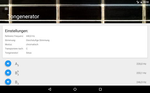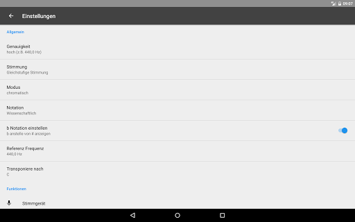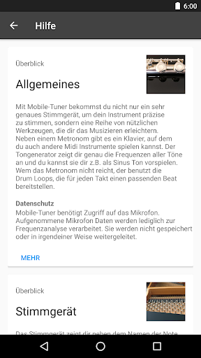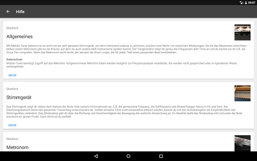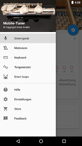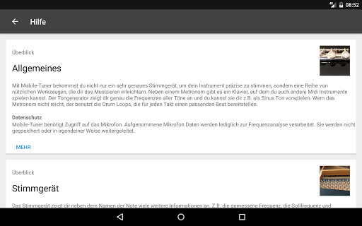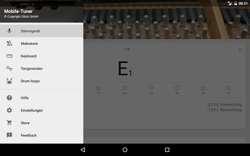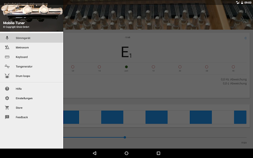 Mit Mobile-Tuner bekommst du nicht nur ein sehr genaues Stimmgerät, um dein Instrument präzise zu stimmen, sondern eine Reihe von nützlichen Werkzeugen, die dir das Musizieren erleichtern. Neben einem Metronom gibt es ein Klavier, auf dem du auch andere Midi Instrumente spielen kannst. Der Tongenerator zeigt dir genau die Frequenzen aller Töne an und du kannst sie dir z.B. als Sinus Ton vorspielen. Wem das Metronom nicht reicht, der benutzt die Drum Loops, die für jeden Takt einen passenden Beat bereitstellen.
