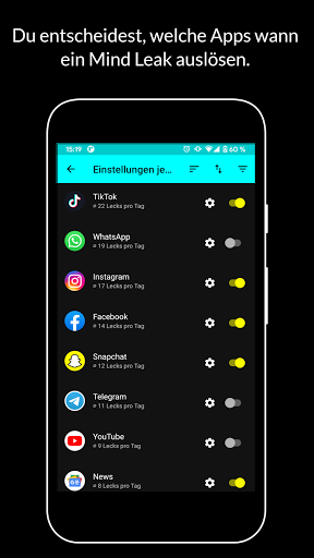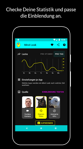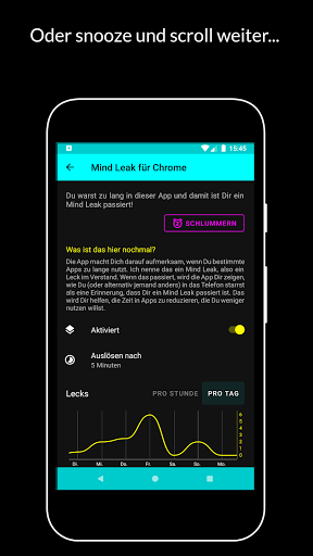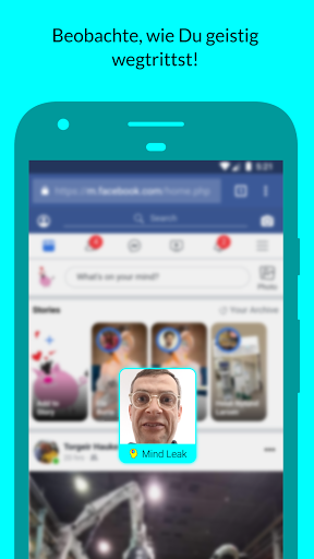 Die App macht Dich darauf aufmerksam, wenn Du bestimmte Apps zu lange nutzt. Ich nenne das ein Mind Leak, also ein Leck im Verstand. Wenn das passiert, wird die App Dir zeigen, wie Du (oder alternativ jemand anders) in das Telefon starrst als eine Erinnerung, dass Dir ein Mind Leak passiert ist. Das wird Dir helfen, die Zeit in Apps zu reduzieren, die Du weniger nutzen willst.
