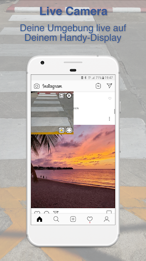 Mit Live Camera for Facebook wird Deine Umgebung live auf Dein Handydisplay übertragen. Mit dieser cleveren und simplen Overlay Camera kannst Du Unfälle und Zusammenstöße im Alltag einfach vermeiden. Benutze fast jede deiner Apps, während Deine Umgebung live und direkt im Display angezeigt wird. Smombies und Handy-Fails gehören mit dieser Live Camera der Vergangenheit an. Verschiebe das Overlay bequem auf Deinem Display. Mit nur einem Klick kann die Live Camera einfach vergrößert oder verkleinert werden.