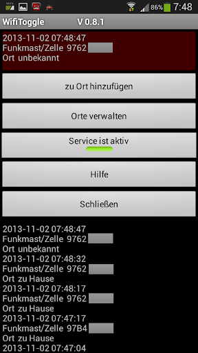 In der oberen Zeile wird die aktuelle Funkzelle angezeigt (LAC und CID), darunter der Ort, wenn zugeordnet.