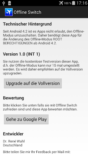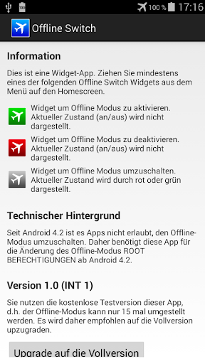 Die Umschaltung des Offline-Modus ist für Apps normalerweise nicht gestattet seit Android 4.2. Deshalb benötigt diese App Root Berechtigungen ab Android 4.2. Falls Sie nicht wissen was Root bedeutet, installieren Sie bitte diese App nicht.
