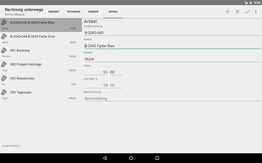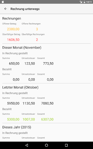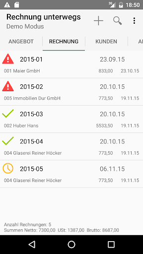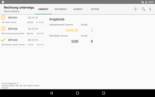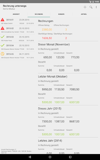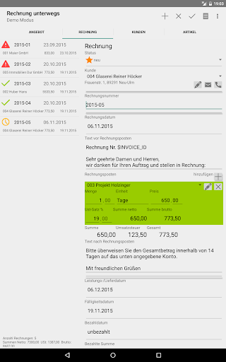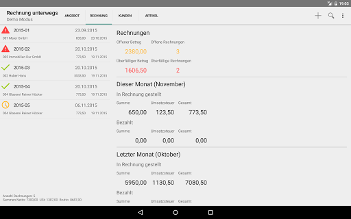 können Sie Angebote und Rechnungen auf Ihrem Smartphone oder Tablet erstellen und als PDF direkt an den Kunden schicken. Auf einen Blick sehen Sie den Status und die letzten Monats- und Jahressummen, sowie die ans Finanzamt zu zahlende Umsatzsteuer.