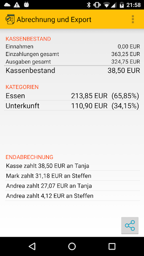 Offlinefähige Reisekostenverwaltung für Unterwegs. Einfach die Ausgaben der Gruppe eintragen und jederzeit einen Überblick haben, wer wem wie viel schuldet oder wie viel Geld noch in der Kasse ist. Auch für Urlaube geeignet in dem man keine gemeinsame Kasse nutzt sondern einfach jeder mal zahlt.